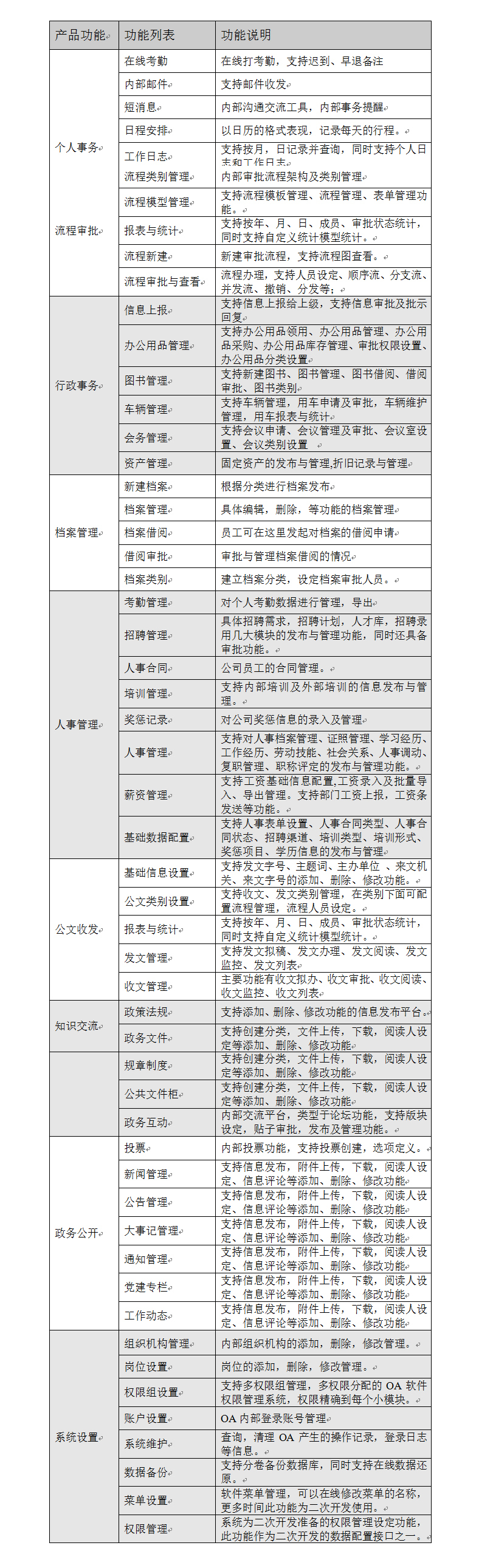 | OA基础功能 | 3800元 | 通讯录、个人文件柜、微消息、手机短信、个人设置、知识库、公共文件柜、网络硬盘、下载管理、企业圈、应用中心、系统信息设置、栏目设置、权限组管理、部门管理、岗位管理、账户管理、菜单管理、门户设置、权限表管理、消息模板 |